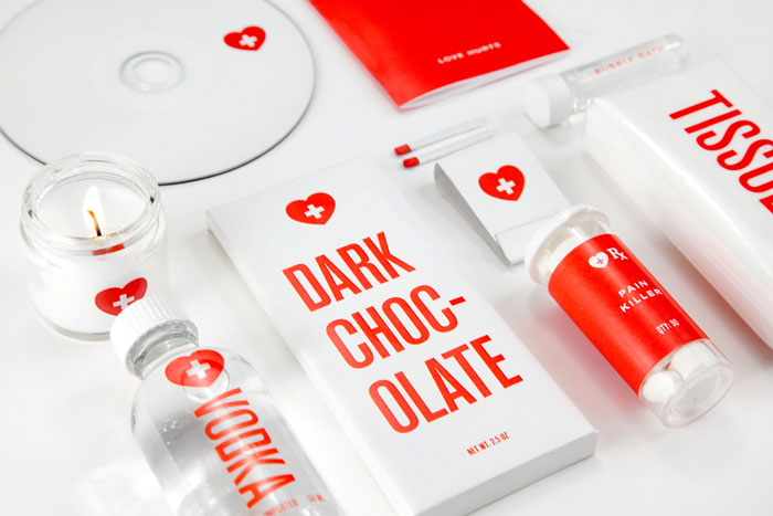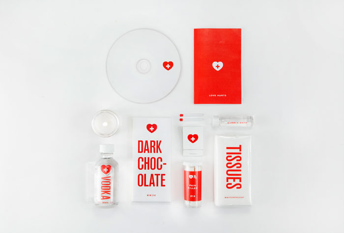 通過一個粗略的分手,如黑巧克力,伏特加,一個優秀的混合光盤,如果一切都失敗,組織。所有的產品整齊地包裝在一個緊湊的套件。